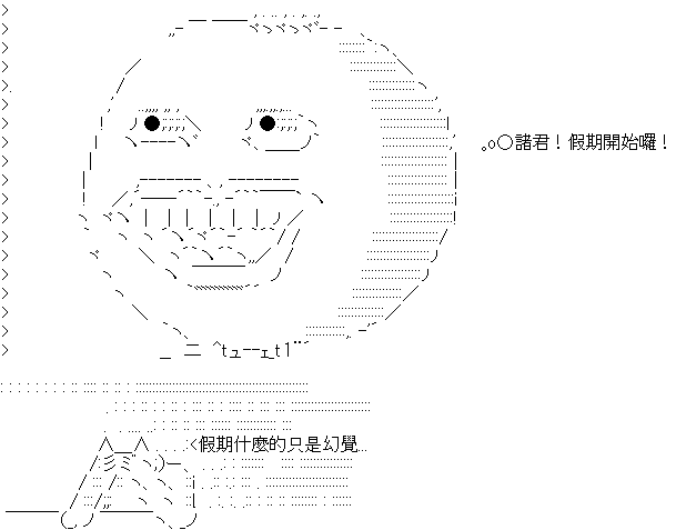> l 丶----丶゙ ヾ、____ノ` ::::::::::::::::::::,' 。o○諸君!假期開始囉!
