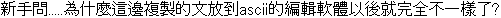 [20124] Re:(無題){20120} Name:名無し Date: 2017/04/08(Sat) 22:49 [画像化 (非透過)] [処理]>新手問.....為什麼這邊複製的文放到ascii的編輯軟體以後就完全不一樣了?