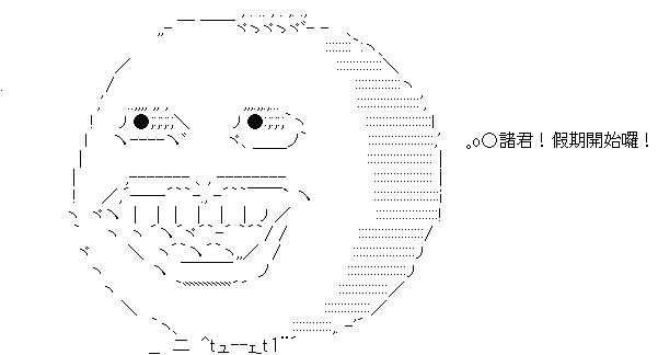 l 丶----丶゙ ヾ、____ノ` ::::::::::::::::::::,' 。o○諸君!假期開始囉!